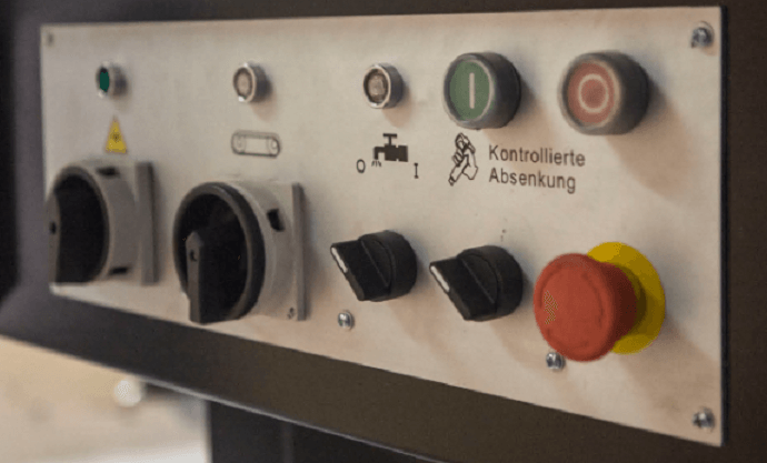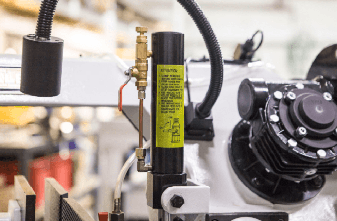 На станках с гидроразгрузкой управление и процесс резки (запуск пилы – опускание рамы – остановка пилы) происходит за счёт запуска двигателя и регулировки гидроцилиндра. Гидроцилиндр имеет переключатель вкл./выкл. гидравлической системы и плавную регулировку опускания рамы верхним маховиком на дроссельном клапане. Предназначен для регулировки и снижения скорости опускания рамы.